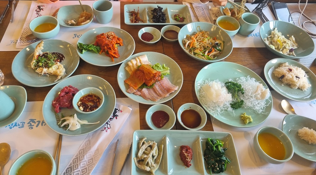 찰밥과 회, 육회, 홍어삼합, 홍어무침, 잡채, 전복, 새우, 떡갈비가 나왔다